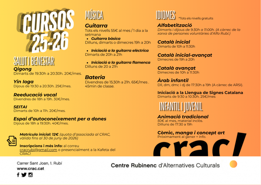 Inscripcions obertes a cracrubi@gmail.com o durant l’horari d’atenció al públic (de 19:00h a 22:00h) entre setmana al CRAC (c/Sant Joan, 1)